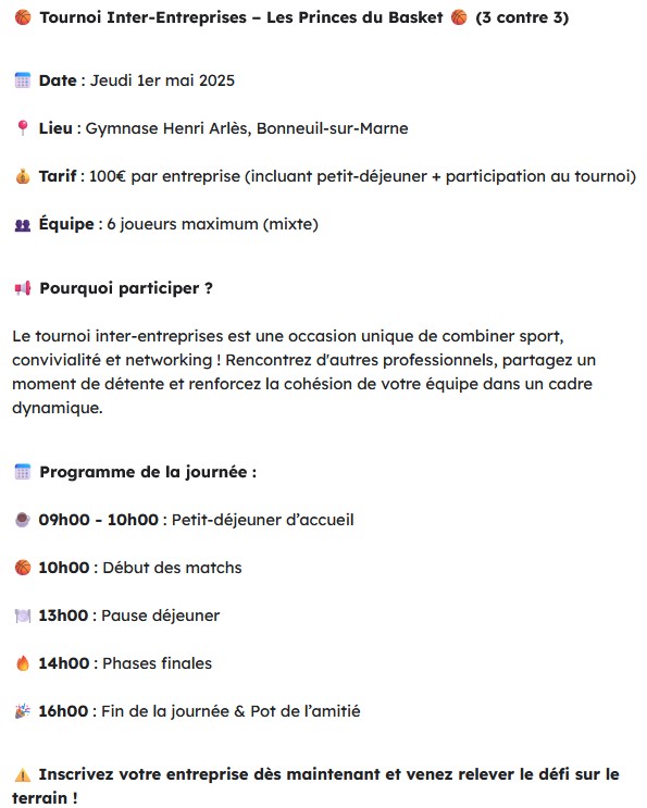 Le tournoi de Basket Spécial Entreprises est l'occasion idéale de fédérer vos équipes autour d'un moment convivial, tout en développant des liens professionnels forts. Venez relever le défi et montrer vos talents sur le terrain !